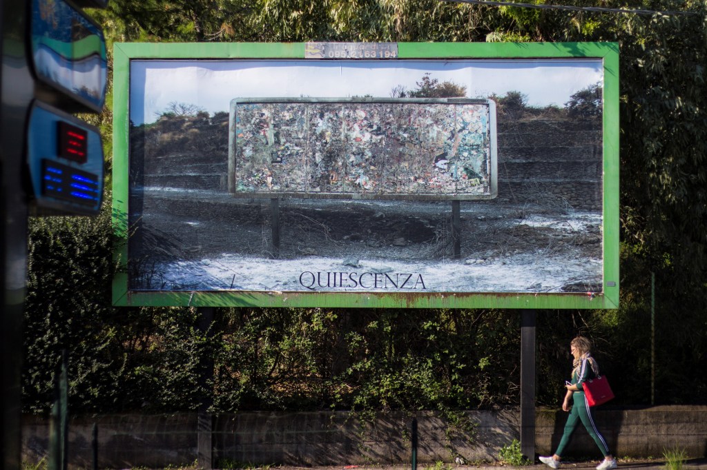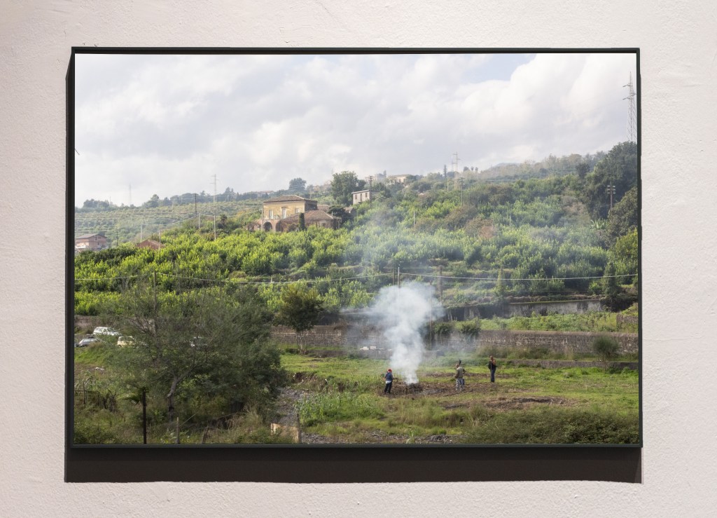 In questo lavoro si vuole mirare ad un concetto di disvisione o disconoscenza con la quale si convive, alimentato dall’architettura dominante di immagini diffuse tramite schermi. Il primo passaggio è la convivenza con il vulcano, ovvero con un terreno in movimento: lì dove il vulcano è inattivo l’uomo dovrebbe essere in attività, dove invece l’attività vulcanica è presente, l’uomo dovrebbe assentarsi e ritirarsi dalle sue attività produttive. Concretamente non è così, l’artificiosità umana, nonostante sia colma di produzioni (di qualsiasi genere) tende a lasciare nel territorio risultati che sembrano non derivare da attività ma da inattività. Le pratiche che una cultura adopera nello spazio e nel tempo sono intrinseche nella quotidianità di ogni suo componente che imita malamente il vulcano: coprendo, bruciando, accavallando, mascherando, costruendo ciminiere, competendo con l’acqua.
